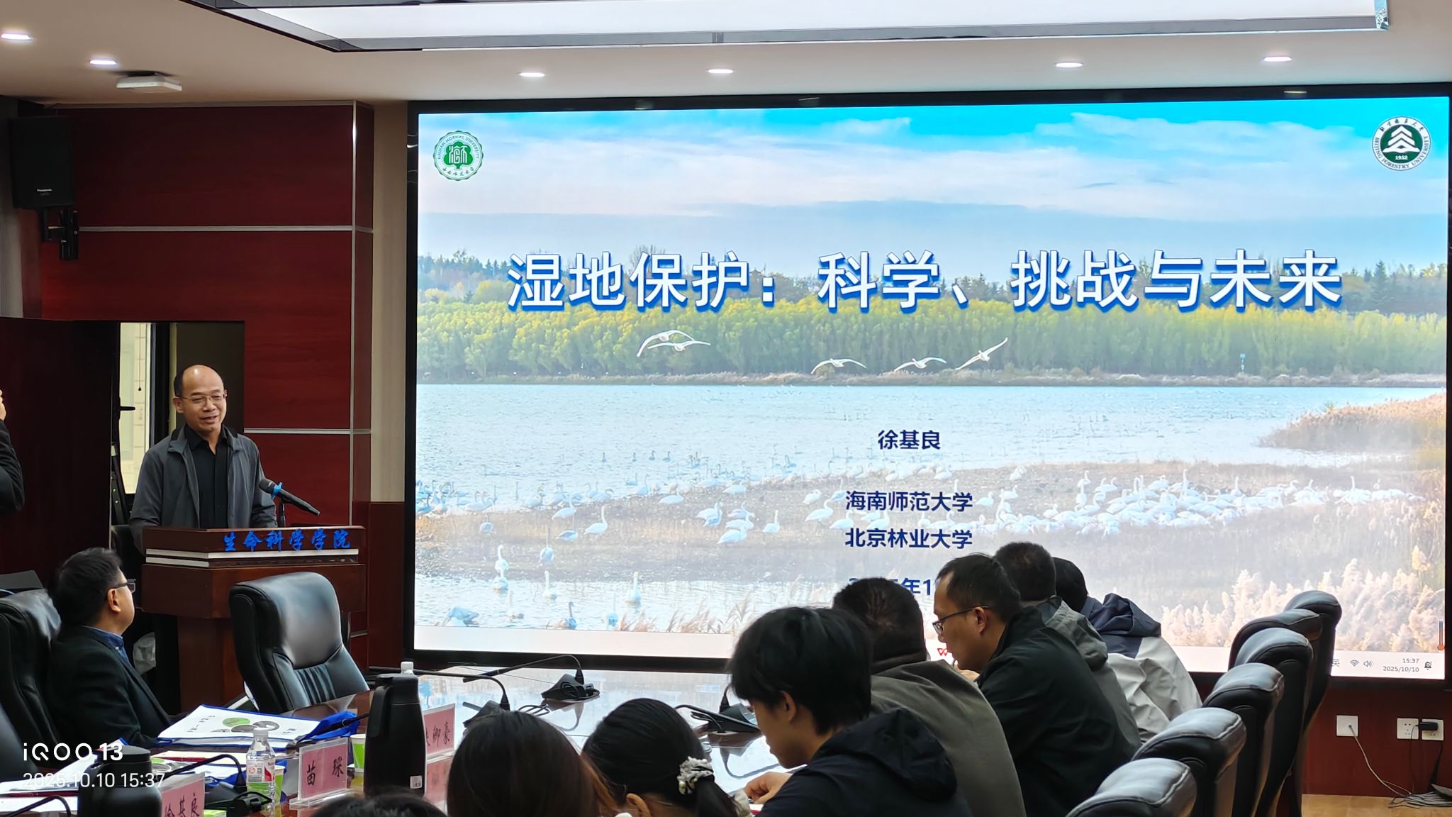 报告会上,徐基良围绕湿地的现状、面临的挑战与可预见的未来三个核心板块展开。他深入讲解了湿地的定义、分类及其作为“生命支持系统”的根本价值与重要作用,通过聚焦于当前湿地生态所面临的危机,通过翔实的数据与案例,深刻揭示了人类活动与环境变化带来的严峻挑战。通过对比破环前后修复湿地环境所需资源,强调了“保护优于修复”的核心理念,系统梳理了《湿地公约》及我国相关政策法规的演进与发展,展现了我国在保护环境理念和实际行动上做出的巨大贡献。