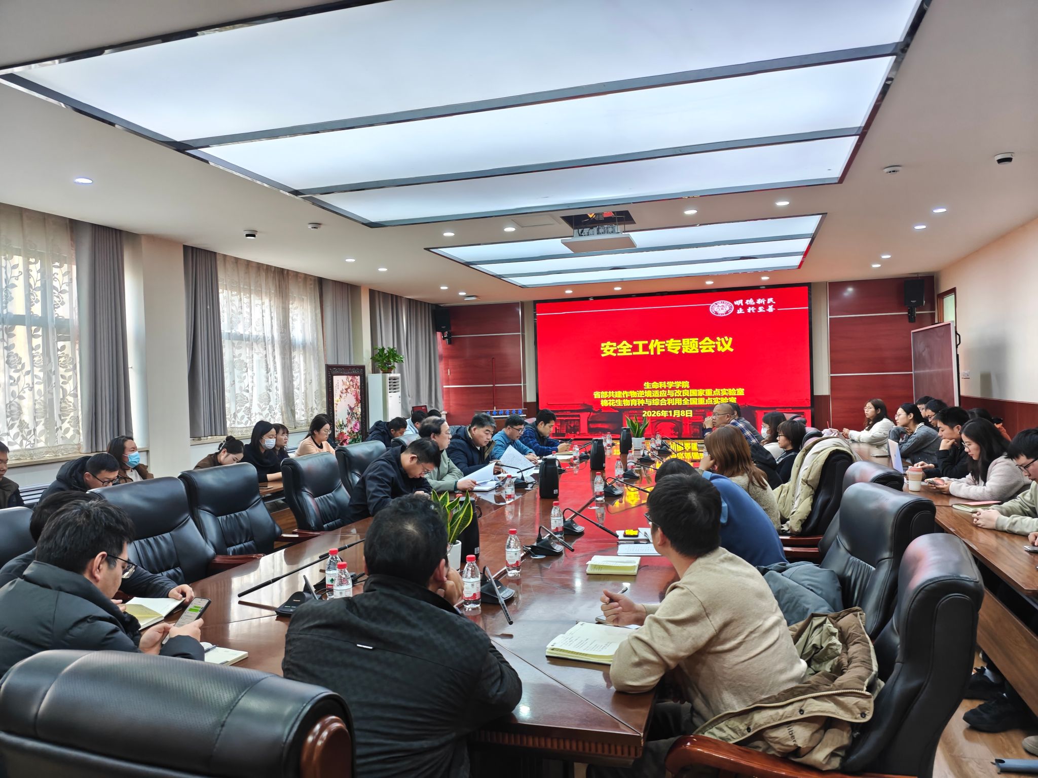 1月8日,生命科学学院、省部共建作物逆境适应与改良国家重点实验室/棉花生物育种与综合利用全国重点实验室在学院B201会议室召开安全工作专题会议,紧扣“明制度、查隐患、强责任”工作要求,全面部署安全管理工作。学院和国重实验室党政领导班子成员、各实验室及课题组相关负责人参加会议。会议由学院党委副书记宋永鹏主持。
