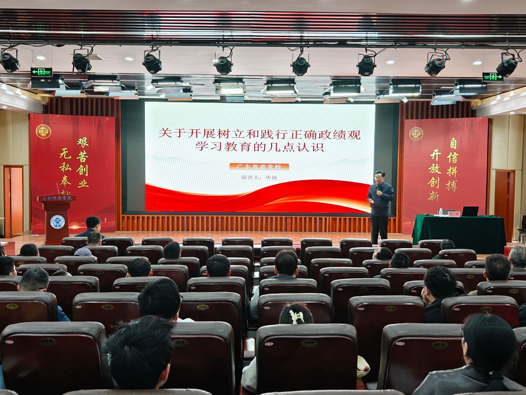 为深入学习贯彻习近平总书记关于树立和践行正确政绩观的重要论述,切实把正确政绩观融入学院 “双一流” 建设,推动学院高质量发展,3月27日,生命科学学院党委组织召开树立和践行正确政绩观专题报告会,邀请河南大学校友、广东省委党校教育宣传专职骨干毕德教授应邀作专题报告,学院党政领导干部和党员代表参加本次报告会。会议由学院党委书记梁建忠主持。