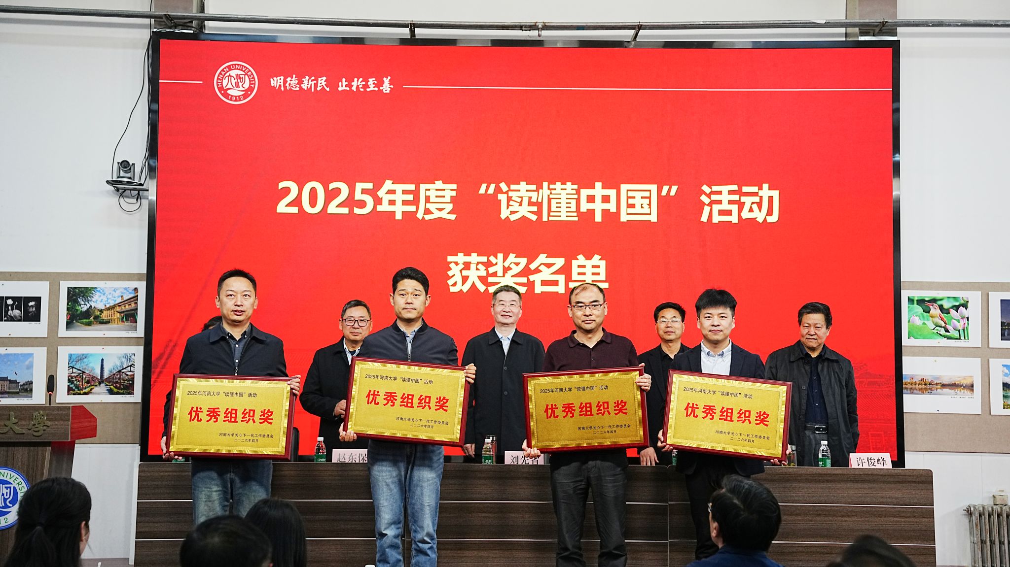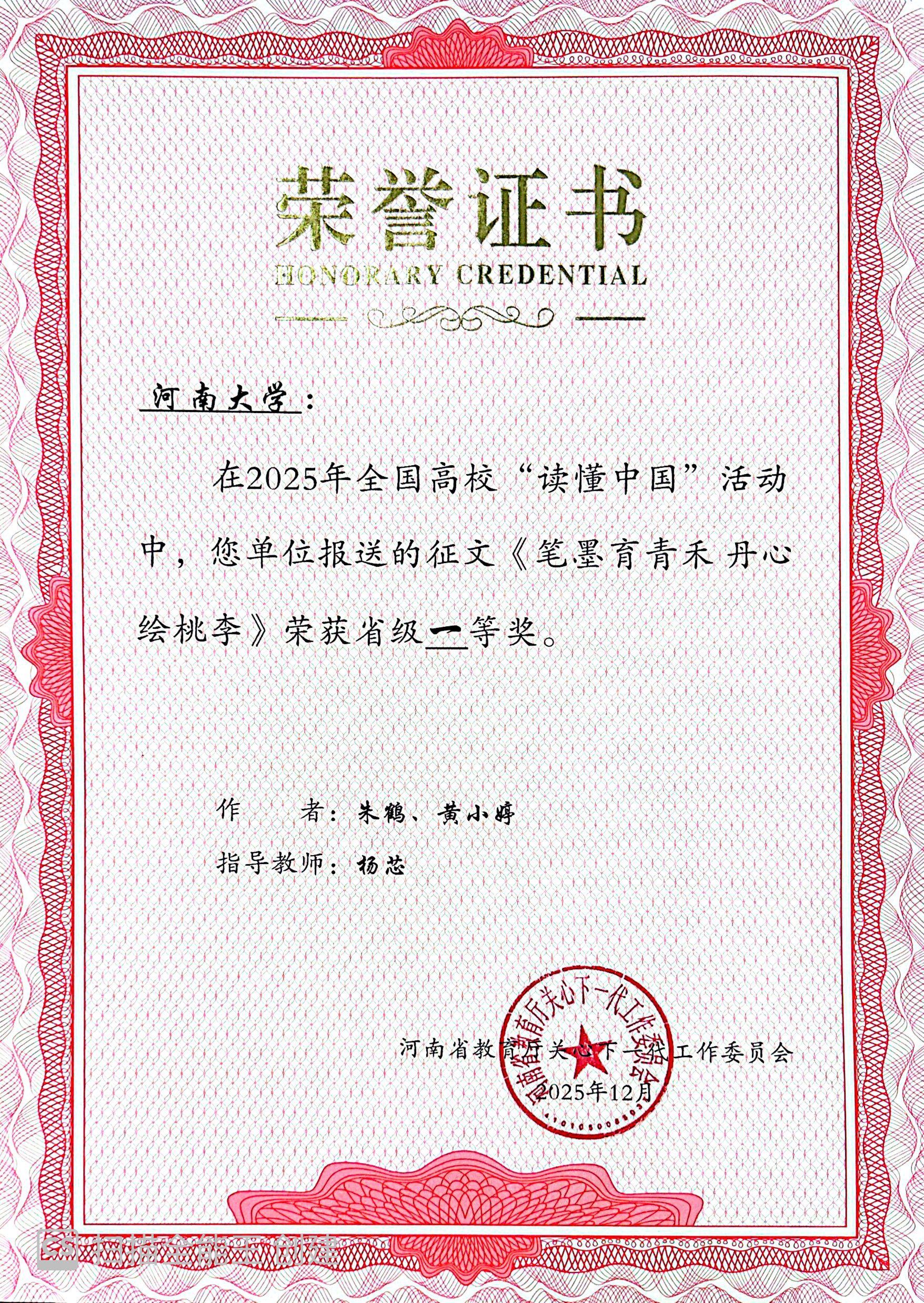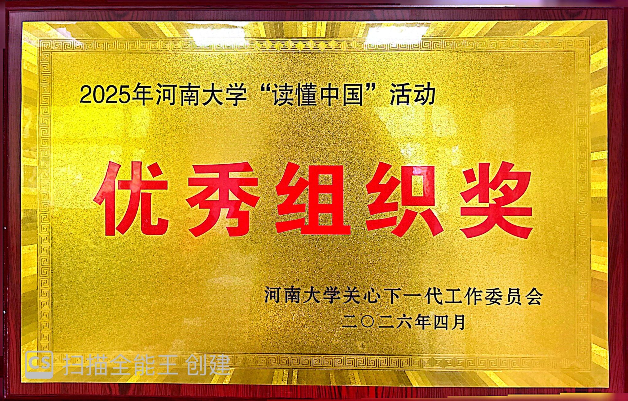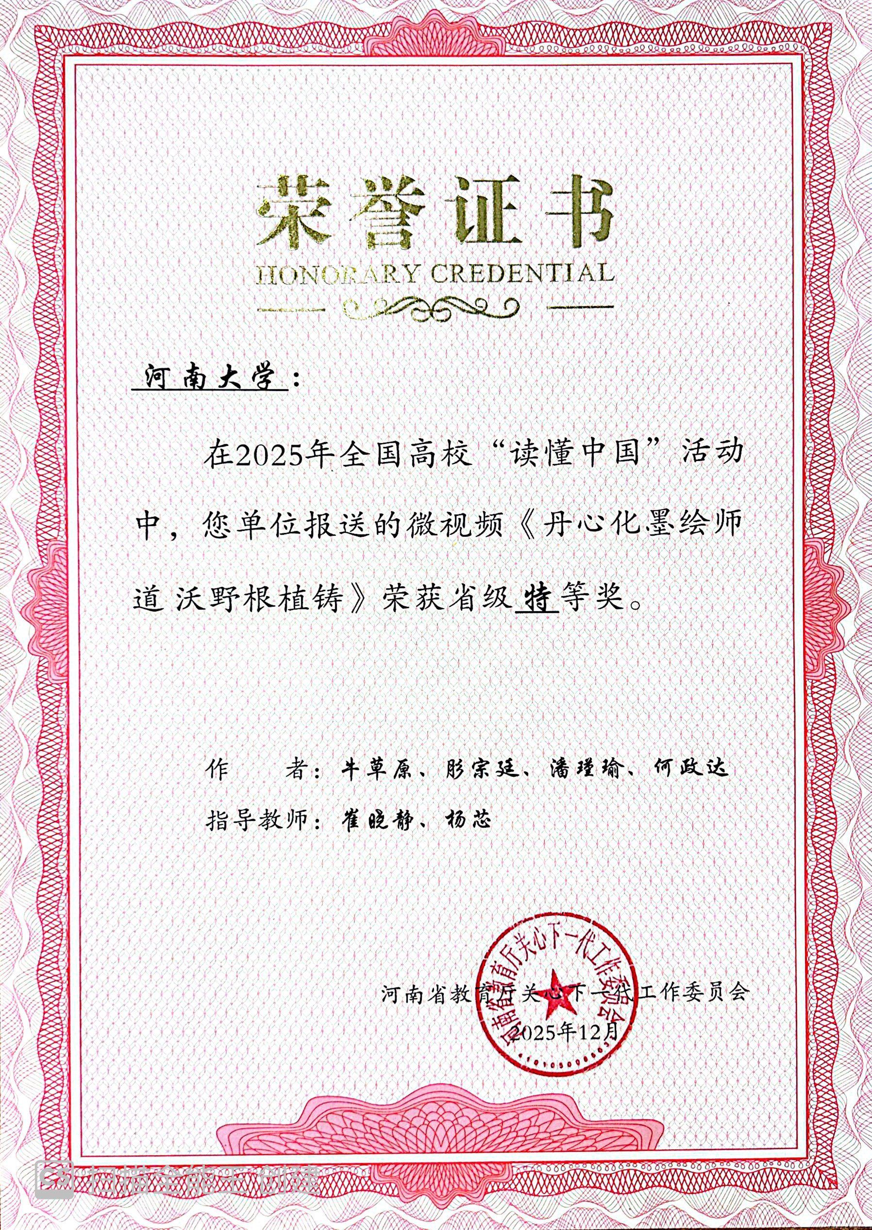 4月3日,2026年河南大学关工委工作会议在明伦校区举行,生命科学学院凭借出色的组织成效和高质量的作品在此次表彰中斩获多项荣誉,获评河南大学2025年“读懂中国”活动“优秀组织奖”,微视频作品《丹心化墨铸师道,沃野植根铸》荣获省级特等奖,征文作品《笔墨育青禾,丹心绘桃李》荣获省级一等奖。指导老师杨芯及学生代表朱鹤、黄小婷上台领奖。