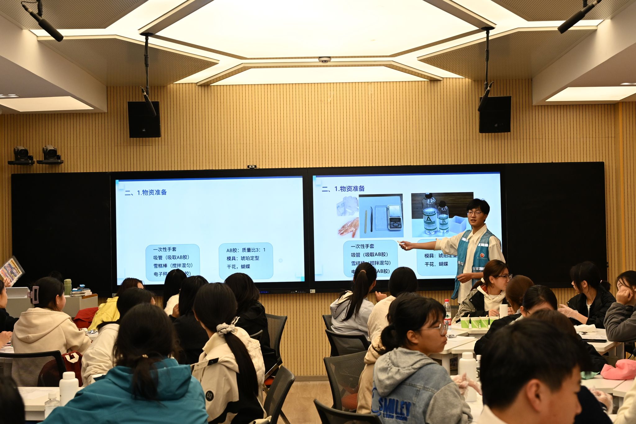 活动准备了充足的制作材料,AB胶、多样模具、干花、昆虫蝴蝶标本等等一应俱全。活动现场,志愿者详细讲述琥珀形成的科学原理及相关科学小知识,结合星火馆馆藏标本实物、视频、图片讲解琥珀制作流程及注意事项,分享了以往活动的精彩瞬间,结合生物实验、野外实习等活动案例,展现了学院大学生优秀的动手能力和团结协作能力。
