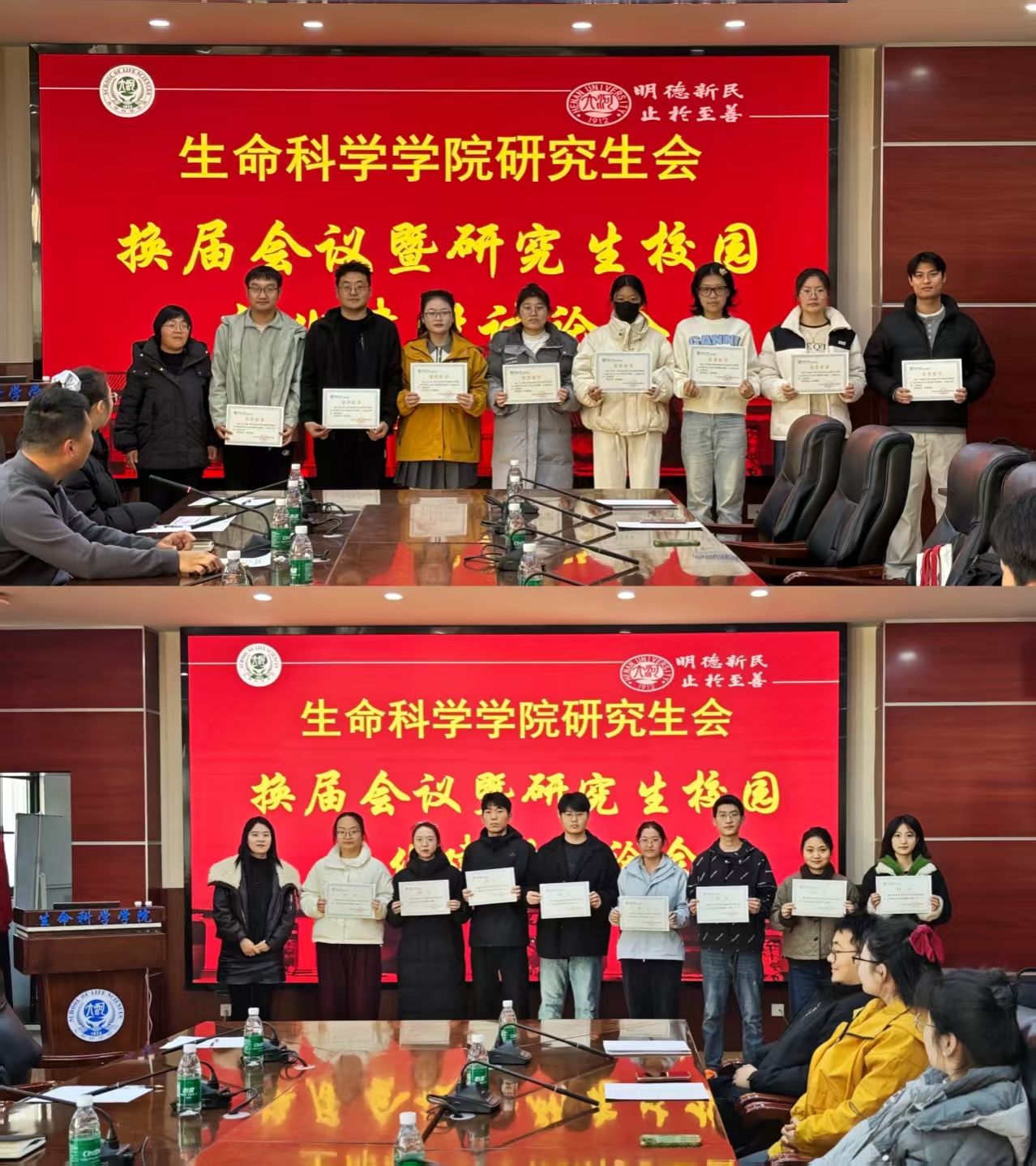 张彭湃宣读《生命科学学院研究生会2025年干部竞聘结果通报》。陈安群为第十九届研究生会主要学生干部颁发荣誉证书,张茜茜为第二十届研究生会主要学生干部颁发聘书。