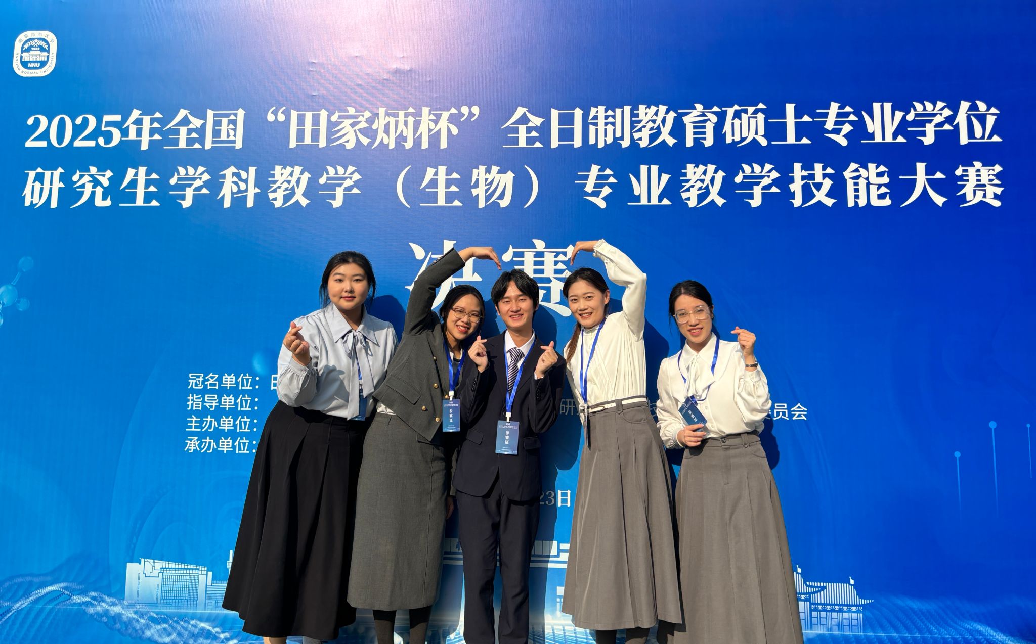 11月22日,2025年全国“田家炳杯”全日制教育硕士专业学位研究生学科教学(生物)专业教学技能大赛在南京师范大学圆满落幕。河南大学生命科学学院5名参赛选手经过激烈角逐,1人获得一等奖,1人获得二等奖,3人获得三等奖,实现了学院在该项赛事中国赛一等奖的新突破!