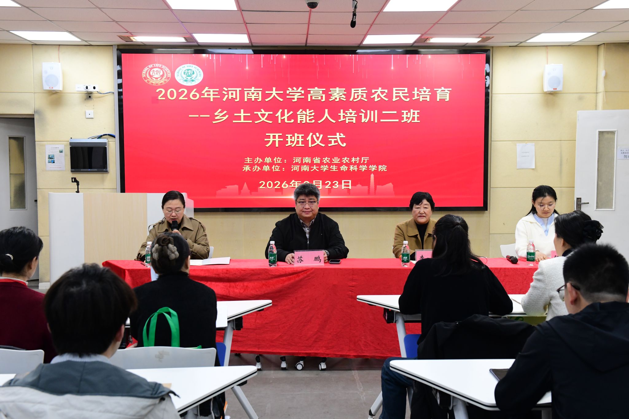 3月23日,河南大学2026年高素质农民培训“乡土文化能人”二期培训班在生命科学学院B101顺利开班。此次培训由河南省农业农村厅主办、河南大学生命科学学院承办,聚焦乡村文化人才队伍建设,吸引了全省55名乡土文化能人齐聚河南大学,共同开启为期11天的系统培育之旅。副院长苏鹏、成教办负责人李黎、培训班课程负责人苏亚蕊、培训班班主任陈小迪出席开班仪式。开班仪式由苏亚蕊主持。