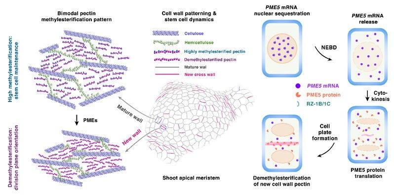 该研究通过免疫荧光标记结合超高分辨率显微技术, 对细胞壁关键组分—果胶的甲酯化分布模式进行了精细解析。研究发现, 高度甲酯化果胶分布于成熟细胞壁, 而新生细胞壁则富集去甲酯化果胶。这一空间异质性由果胶甲酯酶PME5所介导。但值得注意的是, PME5 mRNA在转录后并不立即进入细胞质起始翻译, 而是被RNA结合蛋白RZ-1B/1C滞留于细胞核内。直至有丝分裂启动、核膜解体时, 大量的PME5mRNA才从细胞核释放并迅速翻译为蛋白质, 催化新生细胞板果胶的去甲酯化。果胶去甲酯化赋予了新生细胞板高度可塑性, 使其能够灵活调整方向; 成熟细胞壁的高度甲酯化, 则维持了干细胞的活性和分生组织稳态。该研究揭示了mRNA核内区室化介导细胞壁修饰的精密机制, 解答了植物干细胞命运决定这一核心科学问题。同时, 该机制在玉米、大豆和番茄等多种作物中的保守性, 也为“细胞壁精准设计”育种提供了新的理论路径。