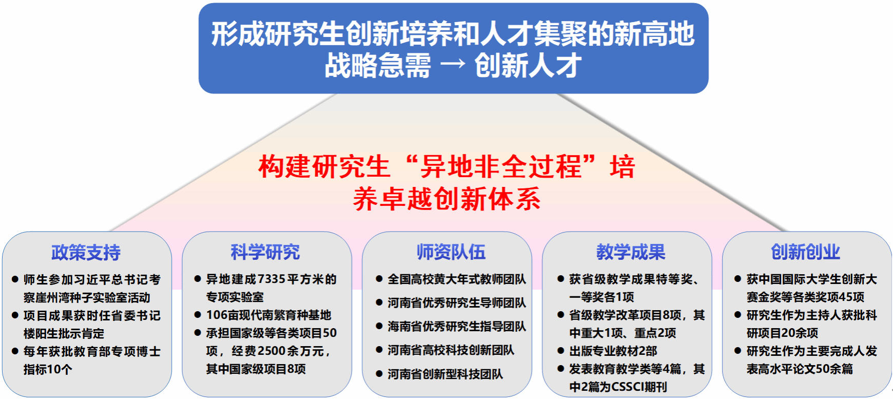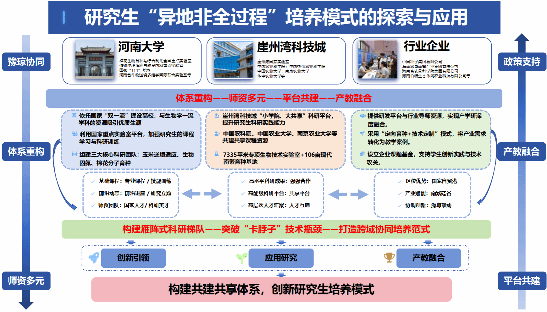 在教育部、国务院学位委员会《关于进一步规范高等学校异地研究生培养的意见》及国家南繁硅谷建设的背景下,本项目积极探索研究生“异地非全过程”培养模式,在保障研究生培养质量的同时,显著提升了服务国家战略的能力。主要创新点如下: